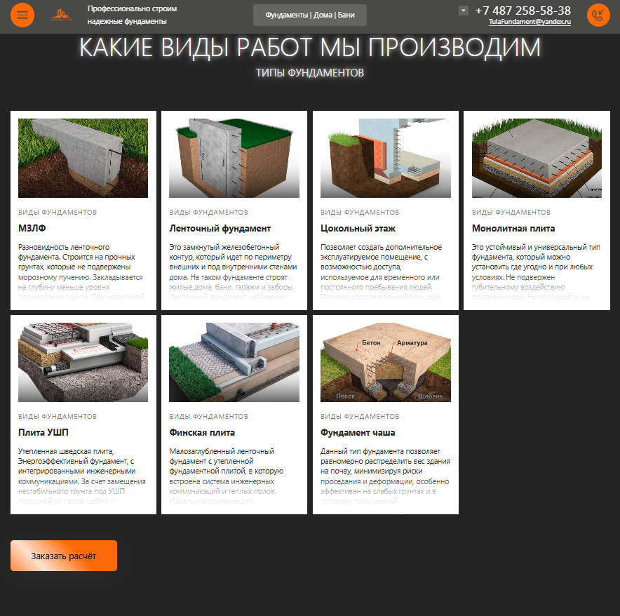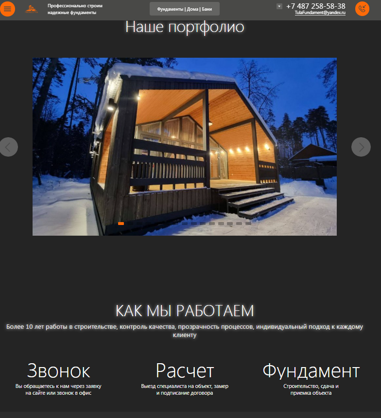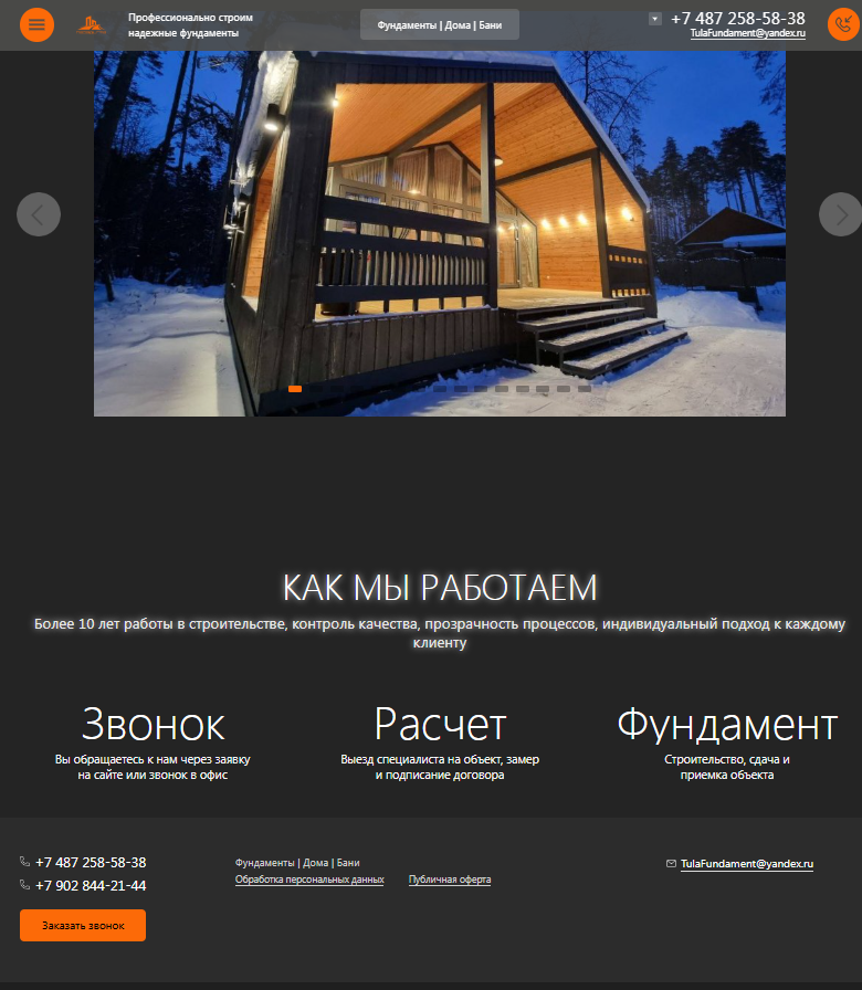 Одностраничный сайт для "Строительство фундаментов, каркасных домов и модульных бань под ключ в Туле"