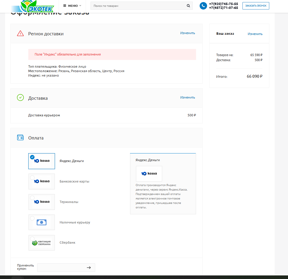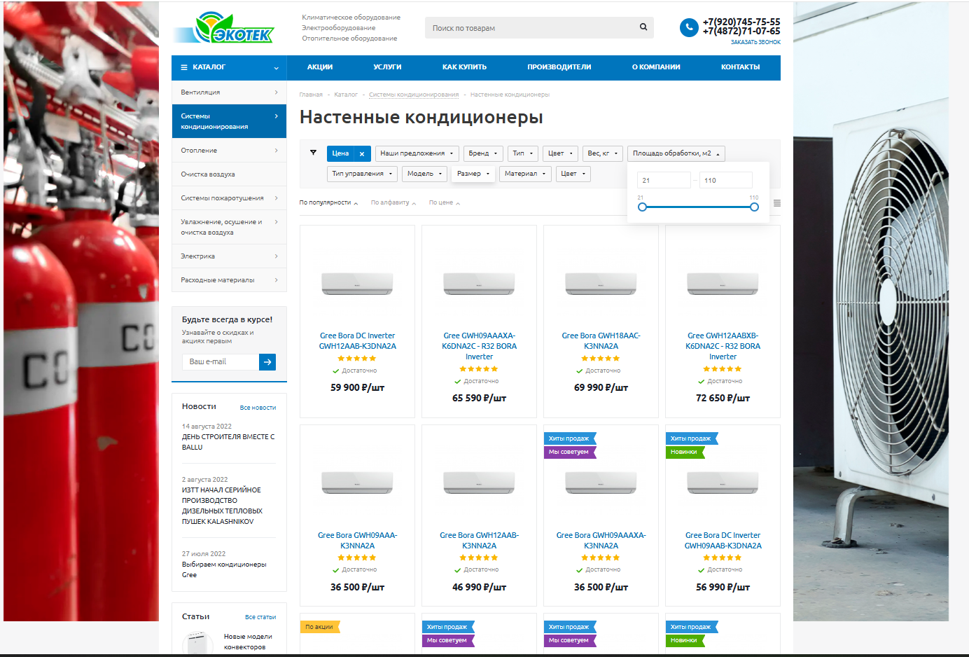 Сайт для компании ООО "Экотек" представляет интернет-магазин с качественно проработанными детальными страницами товаров, на которых выведены основные информация и характеристики товара, приведены технические сведения о продукции.